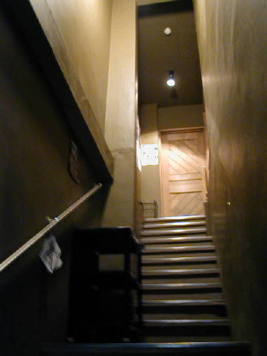 「狭くて急な階段上れば〜」の階段。踊り場にある台にはチラシなどが置かれている。ナラナラジャーナルも。