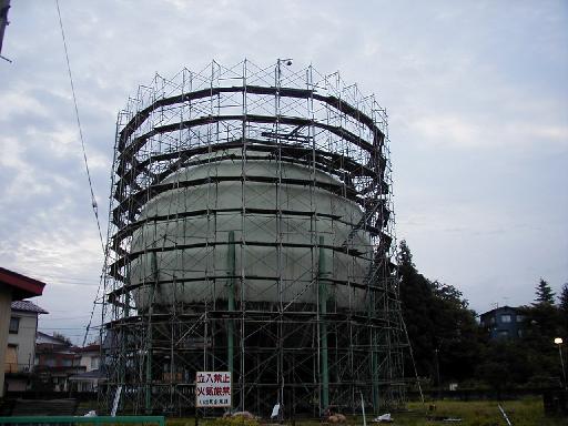 小出町ガスタンク点検、補修足場。もちろん内部も全部足場が組んで有ります。
