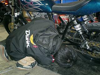 本人が、「顔はまずいです。」というので、俺のバイクのオイル交換作業中の後姿を撮らせてもらった。